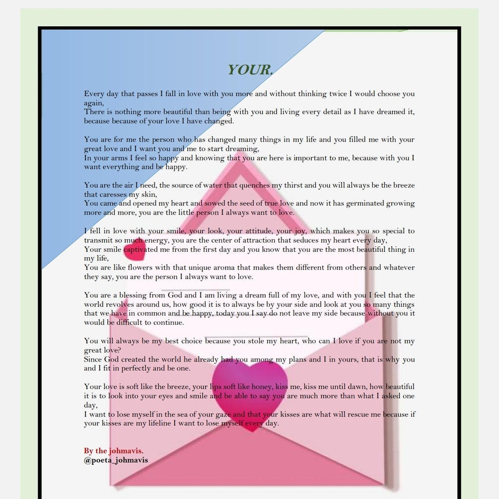 You, it is a letter that is dedicated to her and also to him, it is a letter that has no gender and can be dedicated to either of them. It is a beautiful letter that is in PDF and consists of a single sheet, but with a powerful and beautiful message to dedicate to that special person, and solprende to that little person we love so much, it is a letter that you can send with some kind of gifts, details, as you wish. Take advantage and solprende with this beautiful message of this letter. You don't have to wait for special dates to tell him how much you love him.